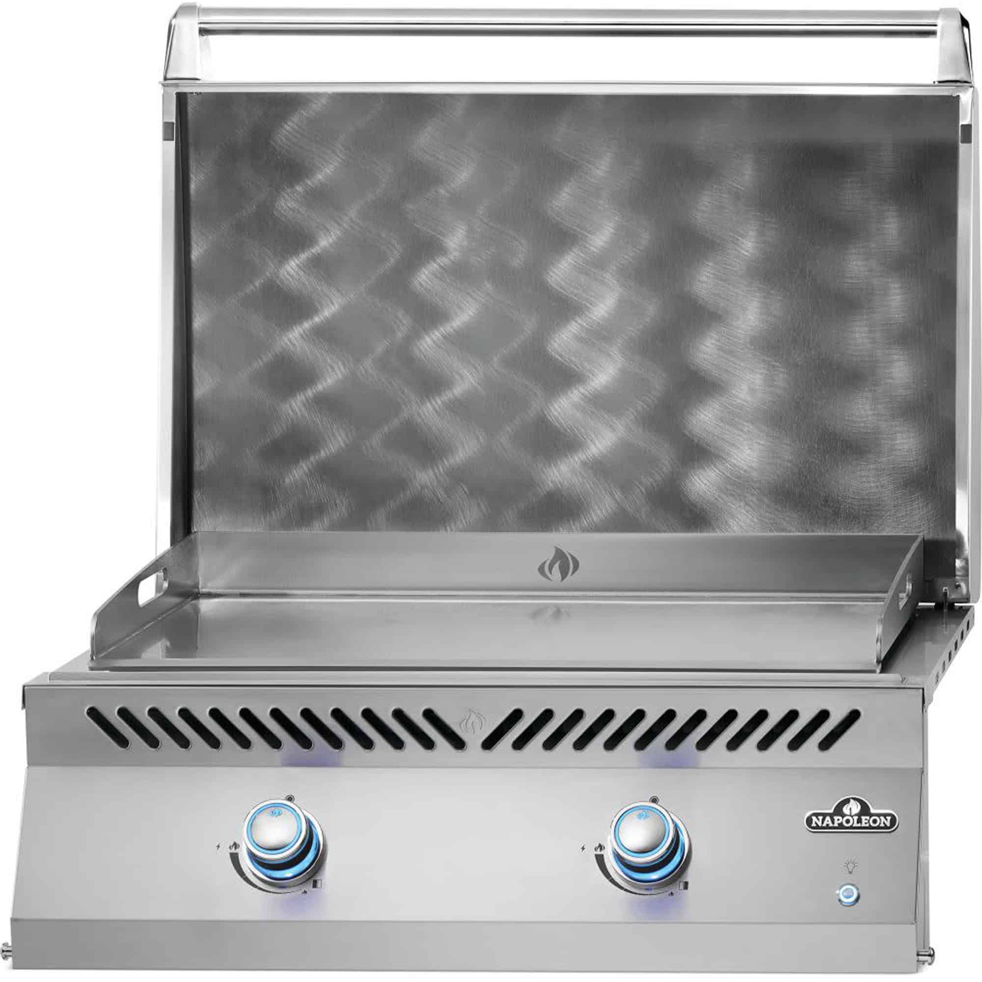 Versatile built-in griddle with dual burners, precision temperature control, safety-lit knobs, and front-access grease management for easy outdoor cooking and cleanup.