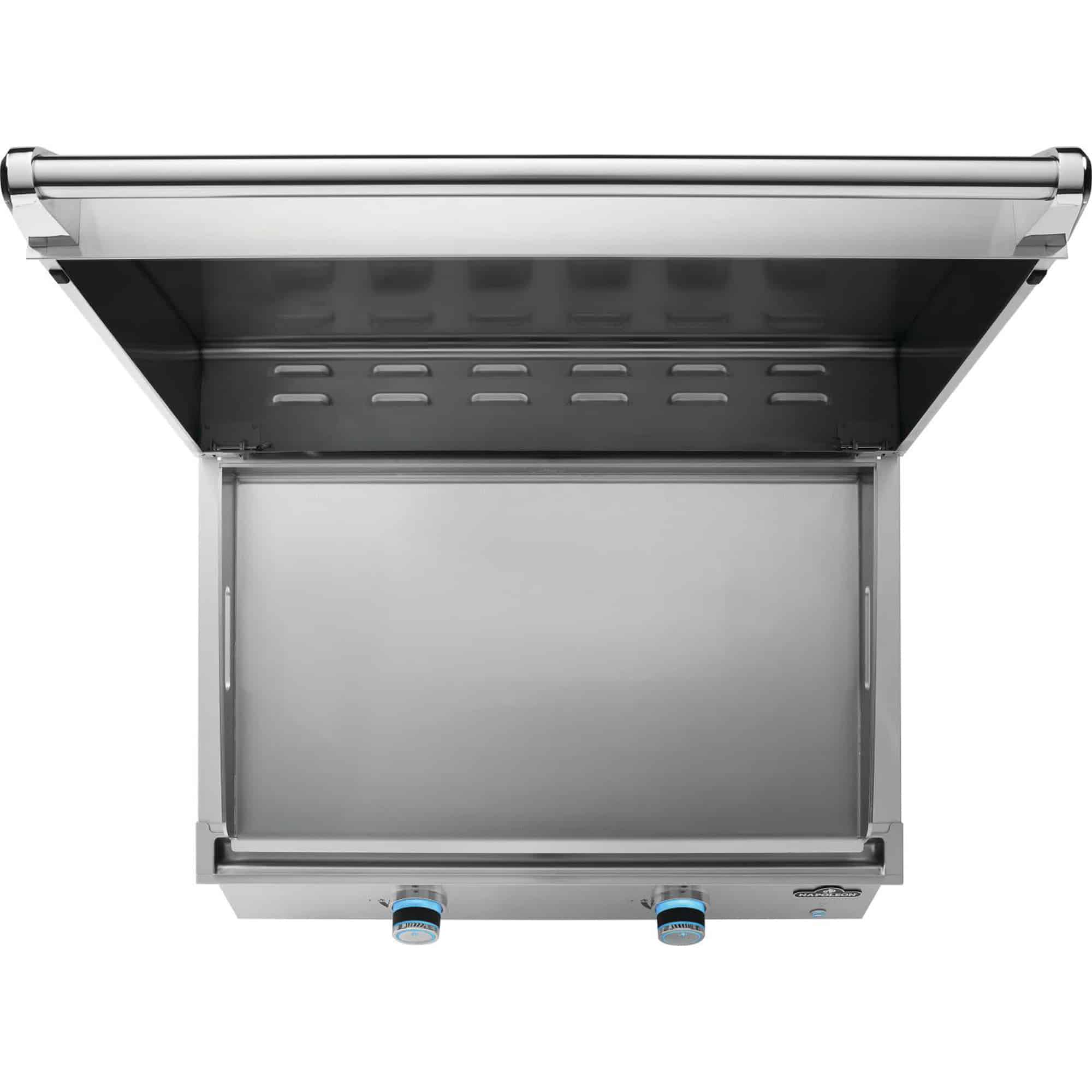 The one-touch ignition system provides quick and reliable startup, while the control knobs feature safety indicators that change color when in use and blink if the flame goes out. A removable lid offers protection when not in use, and the integrated front-access grease management system—complete with a removable tray and built-in scraping tool—makes cleanup fast and convenient. With a standard 32-inch footprint, this griddle is built for seamless installation in any outdoor kitchen setup.