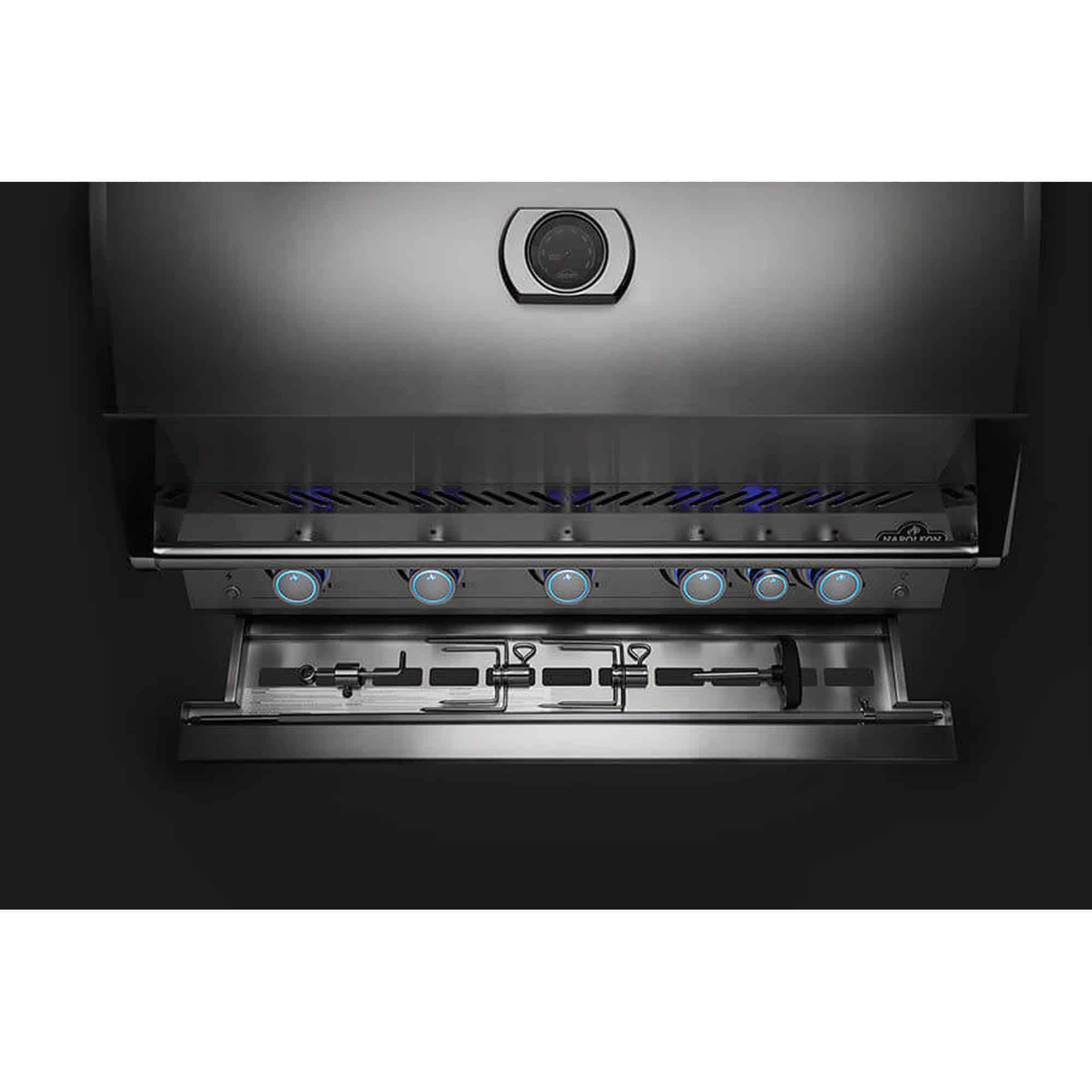 Designed for both function and convenience, this grill includes illuminated control knobs that glow blue when idle and shift to red when burners are active for added safety. Integrated halogen lights brighten the cooking surface for nighttime grilling. The advanced angular grease management system with a perforated design improves cleanup and reduces the risk of grease fires. Engineered for easy installation, it features integrated trim, an extended flex line, and longer electrical wiring for maximum placement flexibility without compromising design.