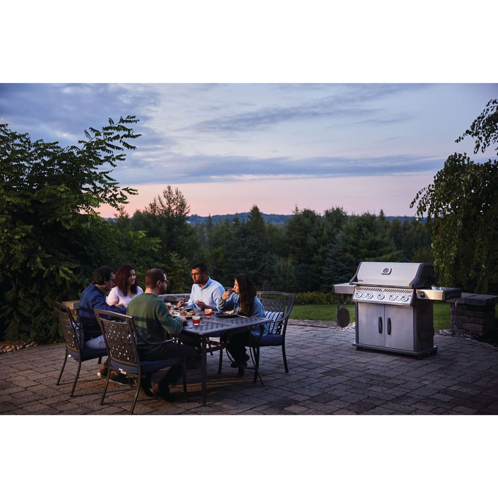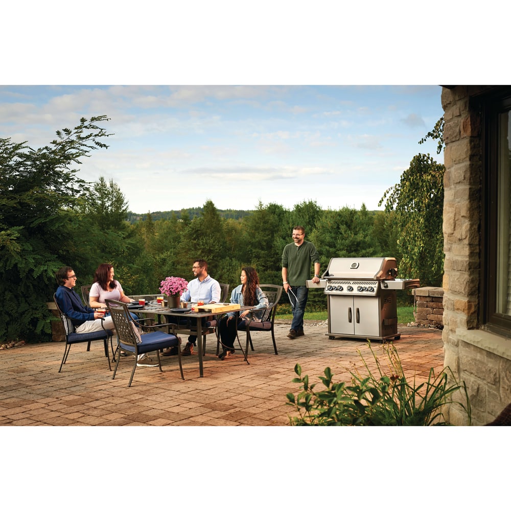 The Napoleon Rogue® SE 625 Stainless Steel Propane Gas Grill with Infrared Side Burner and Rear Burner is a durable stainless steel grill. Featuring five main burners, a rear rotisserie burner, and a high top lid, this grill has everything you need to create gourmet meals. Sear restaurant-style steaks on the integrated sear station, while generous side shelves provide plenty of prep space.