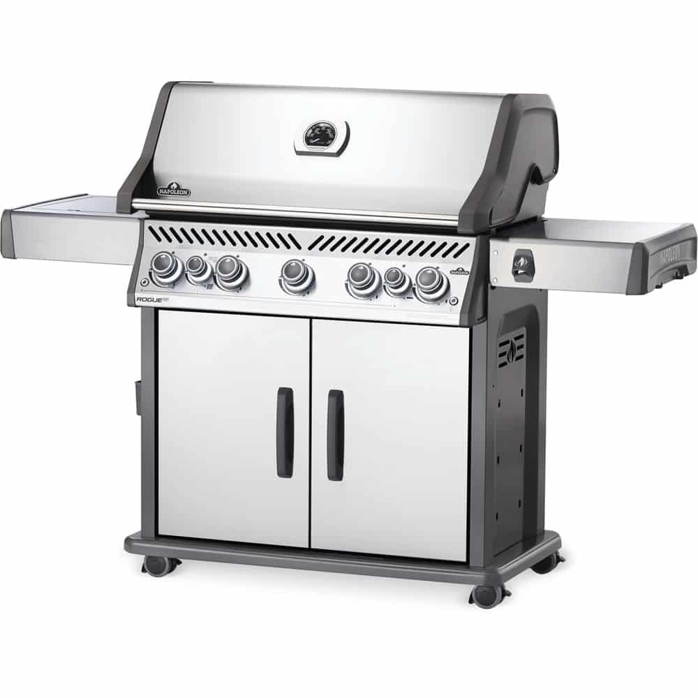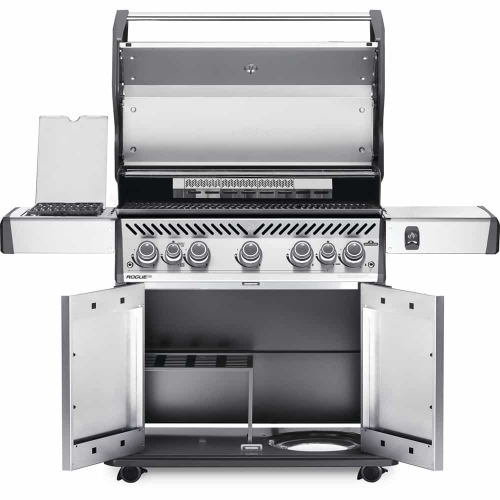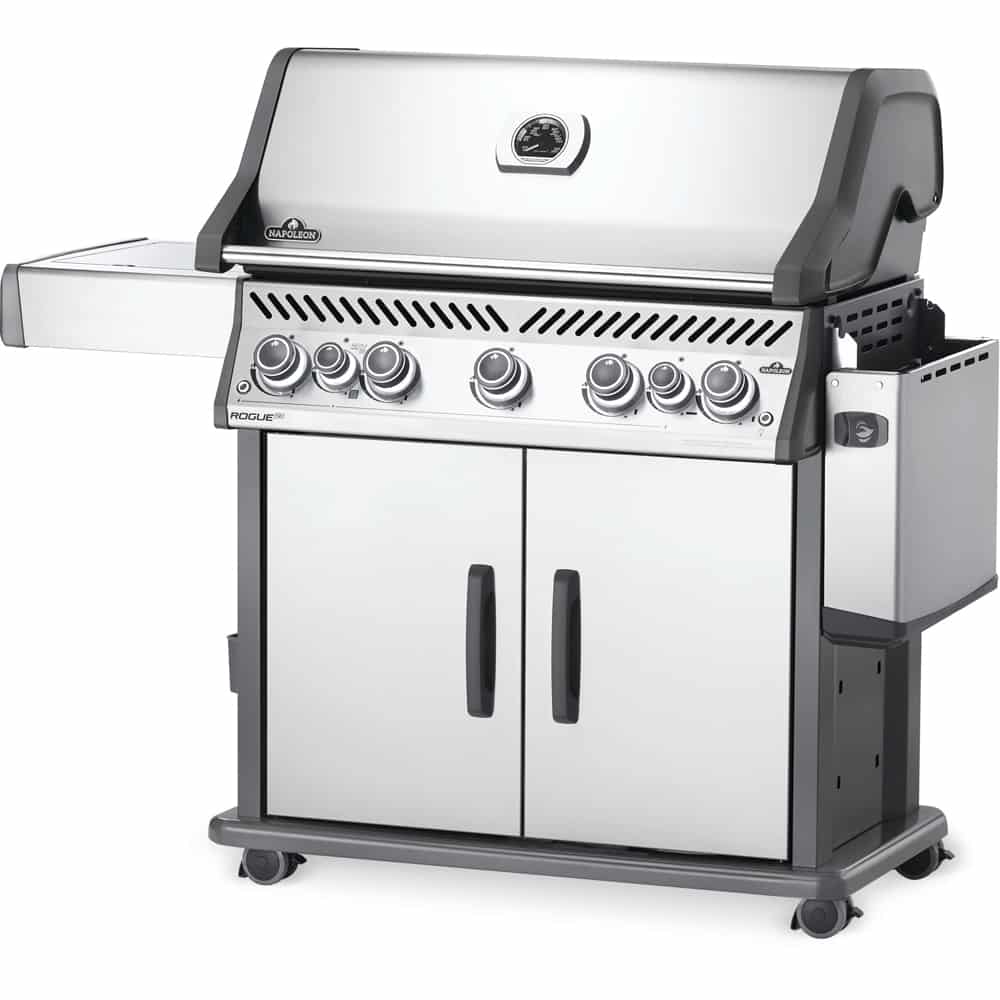 The Napoleon Rogue® SE 625 Stainless Steel Propane Grill with Infrared Side Burner and Rear Burner is a durable grill with a porcelain black lid. Featuring five main burners, a rear rotisserie burner, and a high top lid. SKUs: RSE625RSIBNSS-1, RSE625RSIBPSS-1