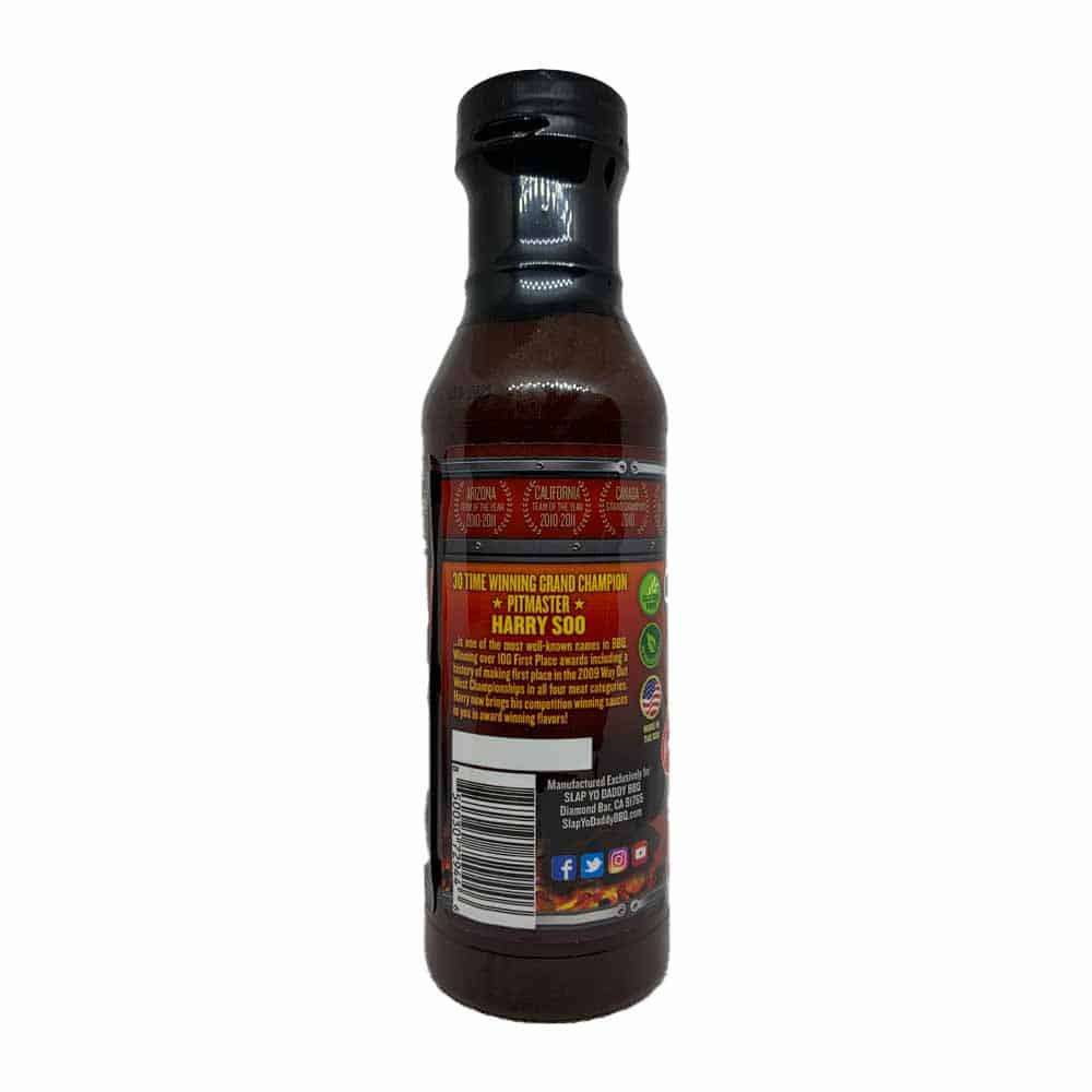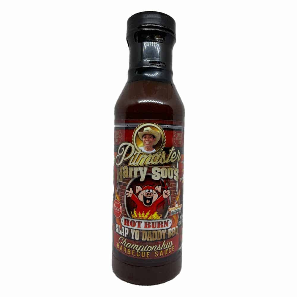 Slap Yo Daddy Hot Burn BBQ Sauce: A different and hot version of Harry’s winning flavors with more tomato flavor, more kick, and a balanced tanginess. It’s complex flavor is a four-phase taste experience. First you taste the flavor followed by the experience of the mild heat a few seconds later which makes your lips and tongue start to tingle, and then it all dissipates. Then you are ready to begin the cycle again. Baste on the last few minutes to form a glaze or pour on just before serving. It also makes a great dipping sauce!