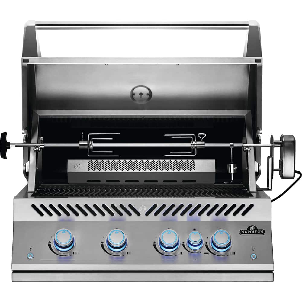 The Built-In 700 Series 32-inch Gas Grill with Rear Infrared Burner provides the high-quality grilling you have come to expect from Napoleon’s gas barbecues, built seamlessly into your ideal outdoor kitchen. The marine-grade stainless construction ensures stylish longevity and unparalleled performance. Thick, 9-mm stainless steel cooking grids are virtually maintenance-free and provide iconic WAVE™ sear marks. Precise temperature control and the ACCU-PROBE™ temperature gauge ensure that you’re searing, smoking, roasting, rotisserizing, and baking with ease. The JETFIRE™ ignition system lights burners quickly with a jet of flame. Enjoy ambiance and safety, the NIGHTLIGHT™ control knobs glow a glorious blue changing to red when burners are in use. The Built-In 700 Series 32-inch Gas Grill has been designed specifically for ease of installation with integrated trim and longer electrical wiring for no design and functionality restrictions on install.