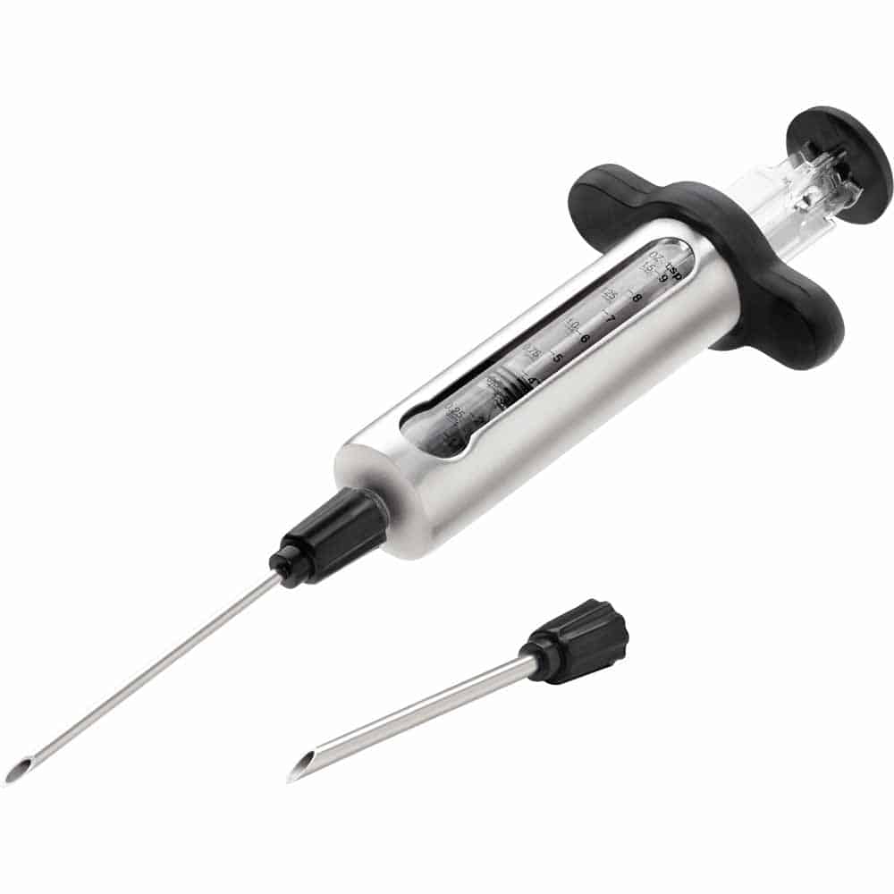 Make your food even more flavorful and prevent dryness with the Napoleon Stainless Steel Marinade Injector. The body is made from stainless steel and features a see-thru window with ounce and teaspoon measurements for measuring the perfect portions. There are two interchangeable needles for injecting based on the type of solution you are using. The smaller gauge is perfect for liquid sauces, butter, wine, and thin marinades. The larger gauge needle is perfect for marinades and injections with small solids like garlic and herbs. Maintaining your injector is easy with the included cleaning brushes. Also included, is a fantastic storage case to make sure everything is stored safely and together. Add the Stainless Steel Marinade Injector to your accessory arsenal and prepare meals that are juicer and more flavorful than ever.